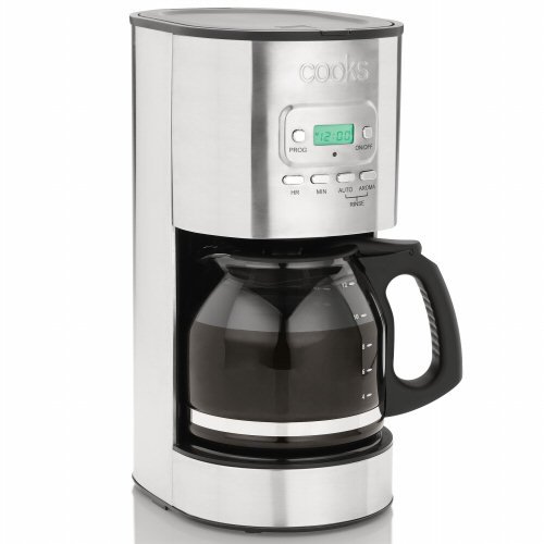A smart choice. This 12-cup programmable coffeemaker by cooks delivers full-flavor coffee with less energy consumption. It uses up to 20% less energy on brew cycle than standard drip coffeemakers, based on independent test results. high-efficiency heater exchange lower-watt hotplate keeps coffee warm program up to 24 hours in advance brews at optimal 180 temperature adjustable for aroma and strength pause 'n serve; LCD digital display ; red light indicates brewing, green light indicates warm rinse function for best flavor 850W. Stainless steel housing with glass carafe and removable filter basket. Metal/electrical parts/glass/plastic. Imported. Available in colors: Brushed St. Available from JCPenny.