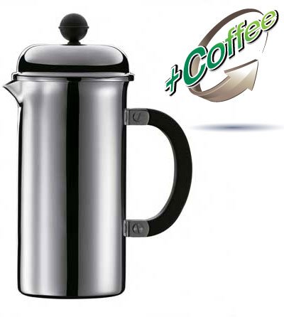Bodum Chambord Hotel 8 Cup Stainless Steel French Press Coffeemaker, 1.0 L, 34-Ounce (includes 1/2 lb Colombia Supremo Gourmet Coffee) Available at Amazon